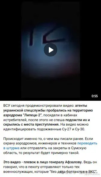 12月20日夜间,在遥远的利佩茨克,乌克兰军情总局的破坏小组成功潜入当地军用机场,纵火焚烧了两架俄罗斯战斗机,分别是编号“红12”的苏-27SM3和编号“红82”的苏-30SM,两架战斗机的核心航电部分和发动机被严重破坏,尚不确定这两架战斗机是否还会被修复,或者干脆报废了事。