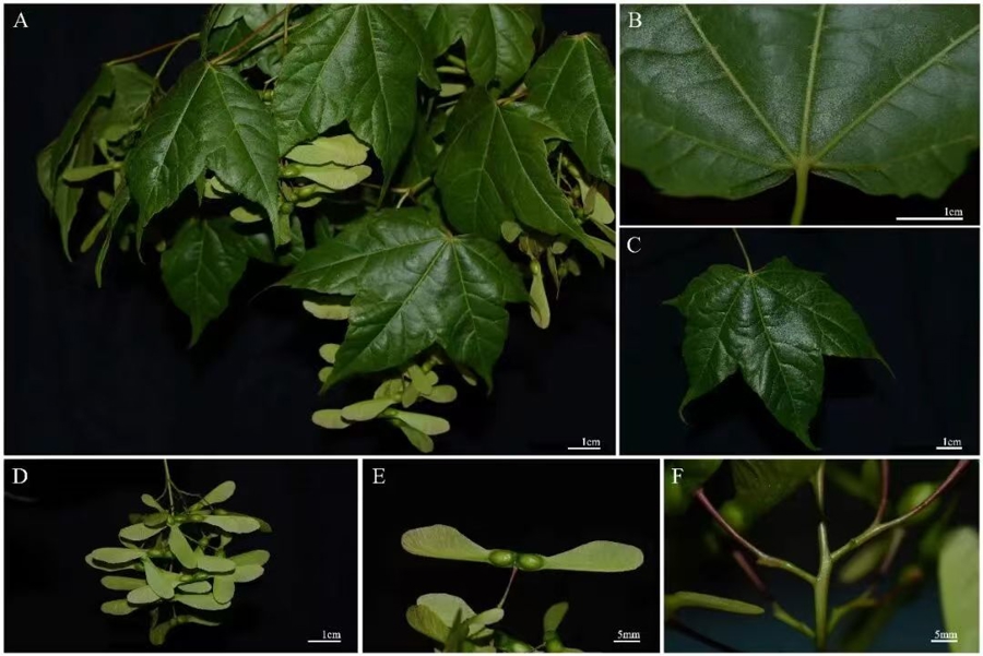 毛脉槭(Acer pubinerve)的形态特征。(A) 叶及结果枝;(B) 叶片下表面;(C) 叶片上表面;(D) 果序;(E) 具双水平翅的翅果;(F) 显示分枝模式的果序部分